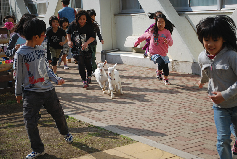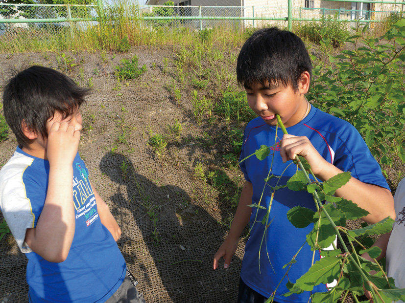 2011年3月11日に起きた東日本大震災で、大きな揺れに襲われたのが八沢小学校だ。校舎は無事だったため、震災後、しばらくの期間は被災した5つの小学校が合流し、一緒に勉強したんだよ。原発事故の影響もあり、なかなか集中して勉強できない環境にありながらも、多くの友だちが「みどりの小道」環境日記に参加してくれたんだ。また、地域の人たちと道路に面した花壇に花を植えたり、エコキャップを集めるなど、さまざまなエコ活動にも積極的に取り組んできたんだよ。
