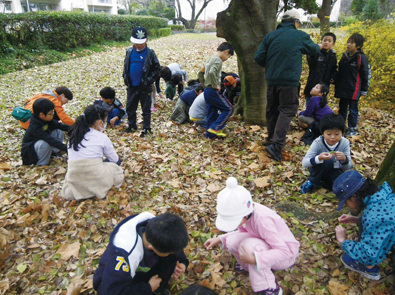 東戸山小学校は、新宿区内で貴重な緑のオアシスとなっている都立戸山公園に隣接している学校だよ。校庭には、約20年前に植えられたウメ、アンズ、カキ、クワなどの実のなる木がたくさん育っているほか、「ヒガトープ」と名付けられたビオトープとその横に田んぼもあるんだ。自然豊かな校庭を戸山公園の一角と考え、各学年が自然環境を生かした授業を行っているんだよ。2012年度に実施した取り組みを紹介するね。