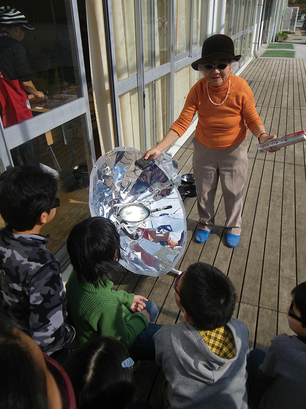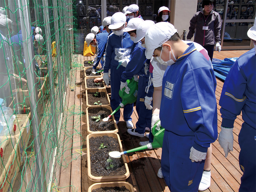 2011年6月、グリーンクロスジャパンなどが協力する形で、ヘチマを植える「緑のカーテン」プロジェクトを行ったよ。伸びた植物の葉は、教室の窓を覆って日差しをさえぎり、教室の温度を下げてくれたんだ。冷房がなくても夏を乗り越えられる室温だったそうだよ。