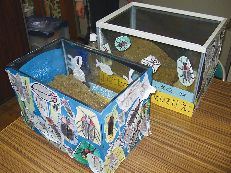 お年寄りにもホタルを楽しんでホタルについて知ってもらうために全校のみんなにPRしたり、小垣江公園のホタル祭りで地域の方々にもPRをしたりしてもらいたいと考えて、介護老人保健施設「かりや」に幼虫を贈呈しているんだ。