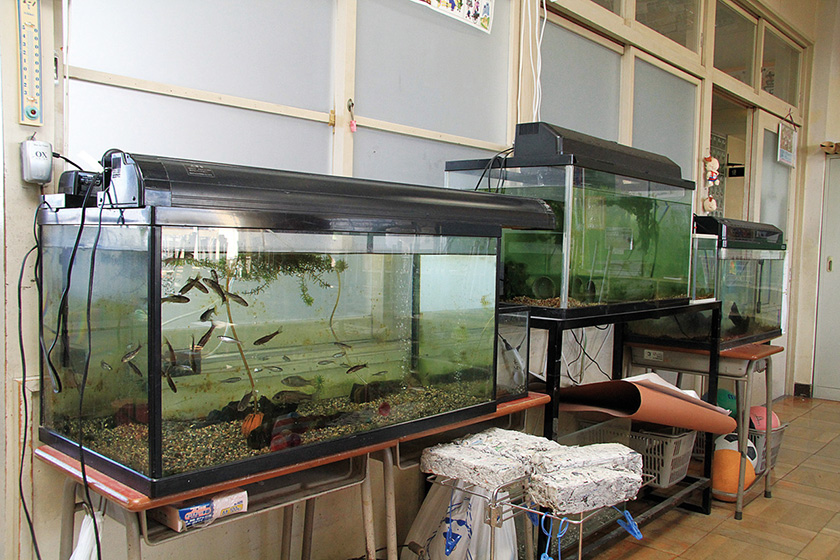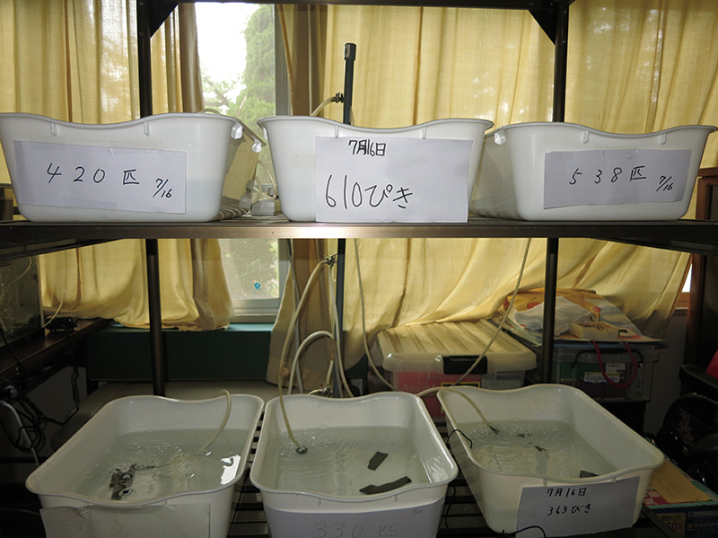 ホタルの幼虫を小垣江公園のホタル小屋や、折戸川、湧水地、学校内のホタル小屋やホタル池などに放流しているんだ。