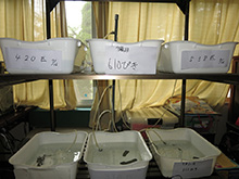 ホタルの幼虫を人工的に育てるために、産卵箱(干物用ネット)に入れて、卵を産んでくれるのを待つんだよ。夏の間は、孵化した幼虫を28℃に保てる部屋で飼育するんだって。