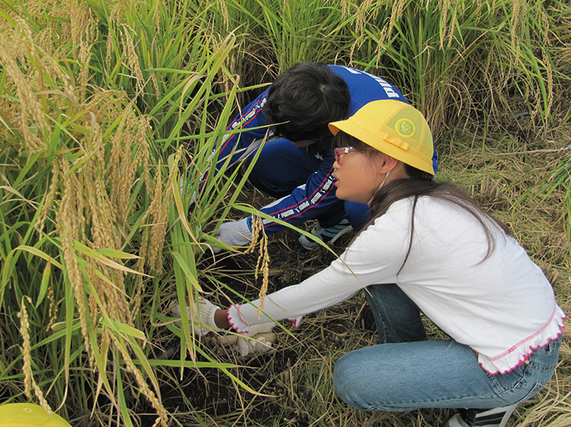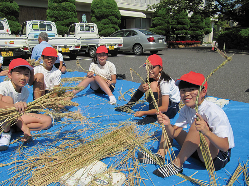 緑水会の方に指導していただきながら、田植えや田の観察、あぜの草取り、稲を束ねるすがい作り、稲刈り、籾すりなどを体験しているんだ。