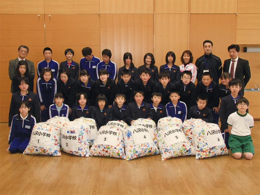 八沢小学校では、エコキャップを集める活動も行っていたよ。いま、中学生になった先輩たちが始めた活動だけれど、一度は途絶えてしまったんだ。そのころから参加していた2人が、みんなに呼びかけた結果、再開したそうだよ。そして、ポリオワクチン1200人分に相当する120キログラムものエコキャップを集め、2012年1月、地元の新聞社を通じて「小さな親切運動」県本部に贈呈したんだ。エコキャップ洗いやシールはがしなど、苦労も多かったようだけれど、贈呈式ではみんなの顔が誇りに満ちていたよ。