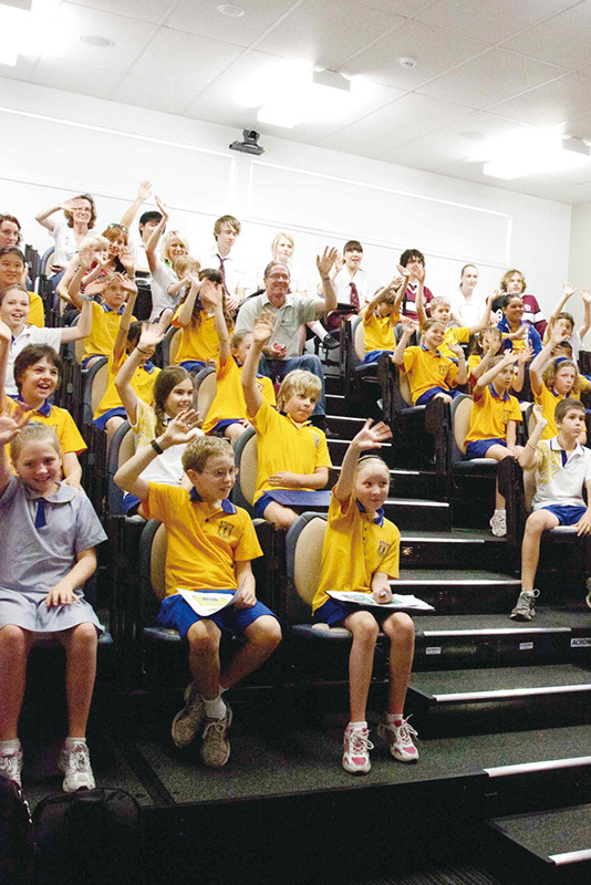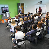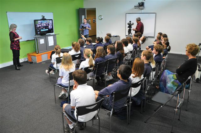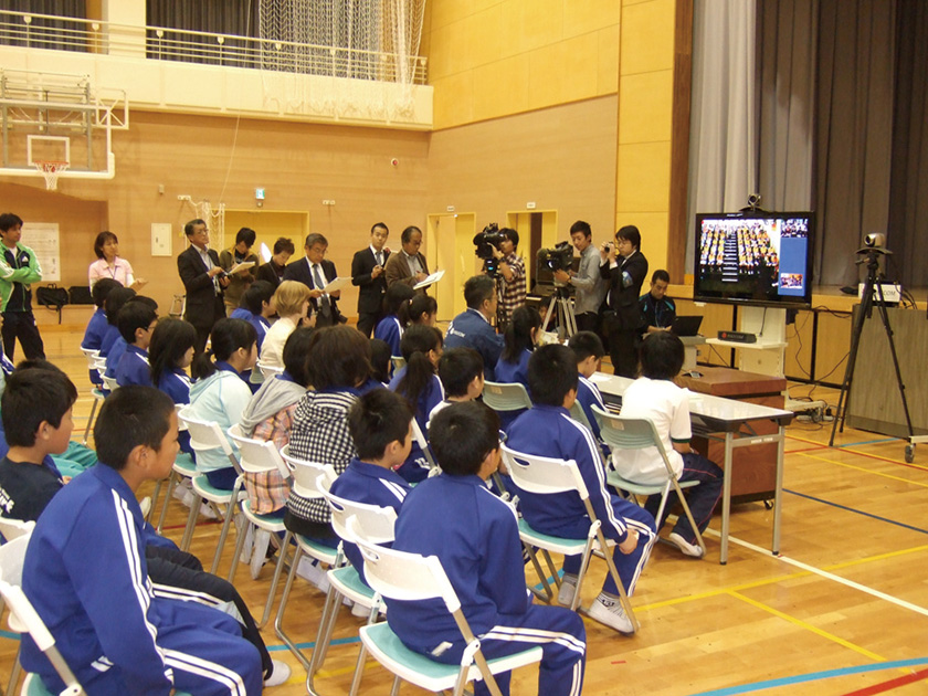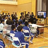 2011年10月26日、八沢小学校と、オーストラリア・クイーンズランド州ブリスベン市のミルトン小学校、ニュージーランド・クライストチャーチ市カシミア小学校が、国際交流授業を行ったよ。インターネットを利用したビデオ会議システムで3カ国をつなぎ、各国会場のスクリーンに映し出されたお互いの映像を見ながら、意見交換などを行ったんだ。 これらの小学校は、「みどりの小道」環境日記に取り組んでいることや、最近、自然災害で被災したという共通点があるんだ。会議は挨拶の交換と、お互いの学校がある環境や、今年起きた災害の報告、地域の紹介から始まったよ。その後、オーストラリアでは有名なレンジャーのステーシーさんが、大洪水の際の動物たちの行動について話してくれたんだ。また、環境を良くしていくために行っていることも発表し合ったよ。さらに各国が順番に「きらきら星」を歌ったほか、文通し合うことを約束したんだ。